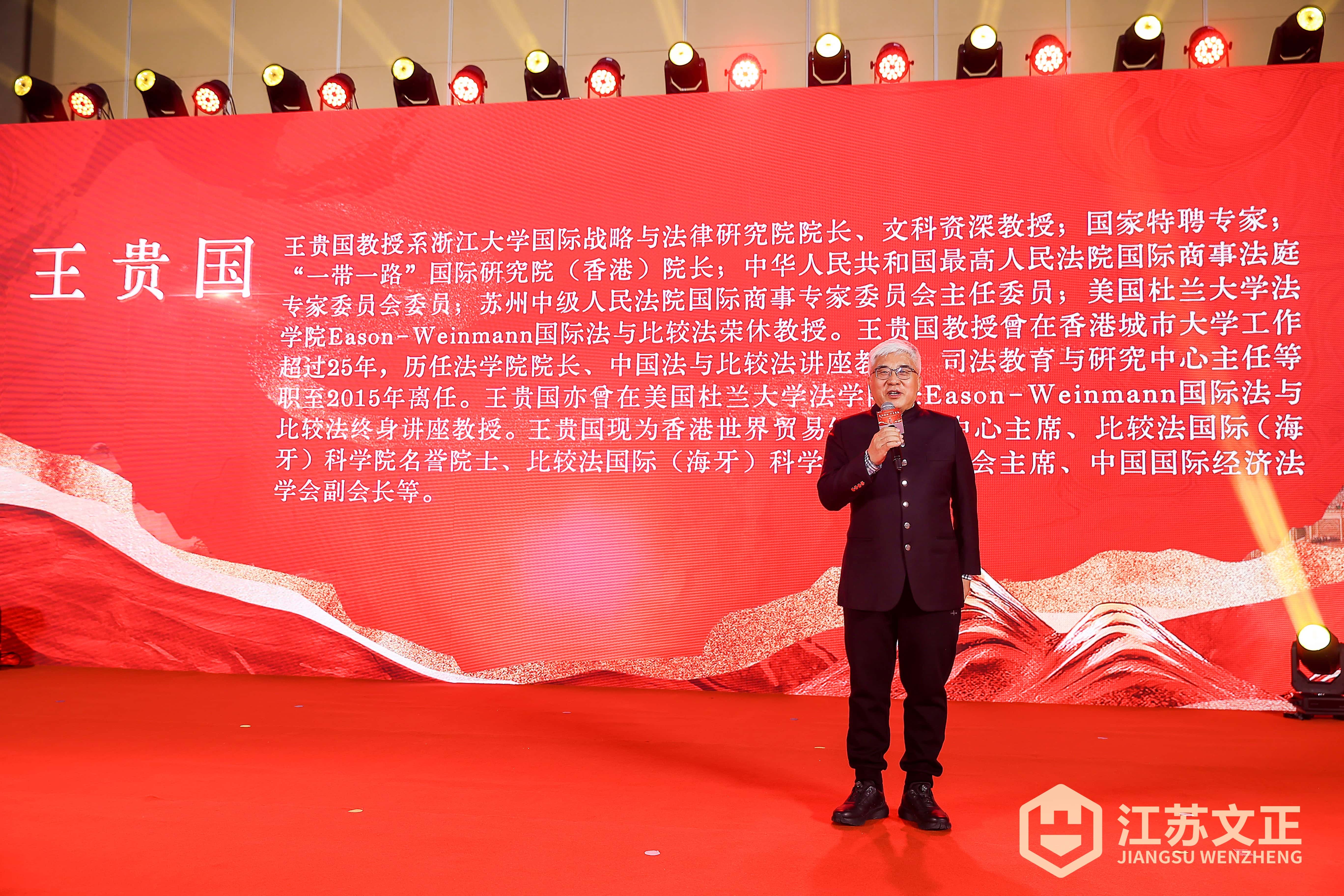 在庆典的高光时刻,本次特邀嘉宾浙江大学国际战略与法律研究院院长、文科教授;国家特聘专家王贵国先生上台,满怀热忱地送上对江苏文正二十周年的深情祝福与殷切寄语,台下掌声雷动。