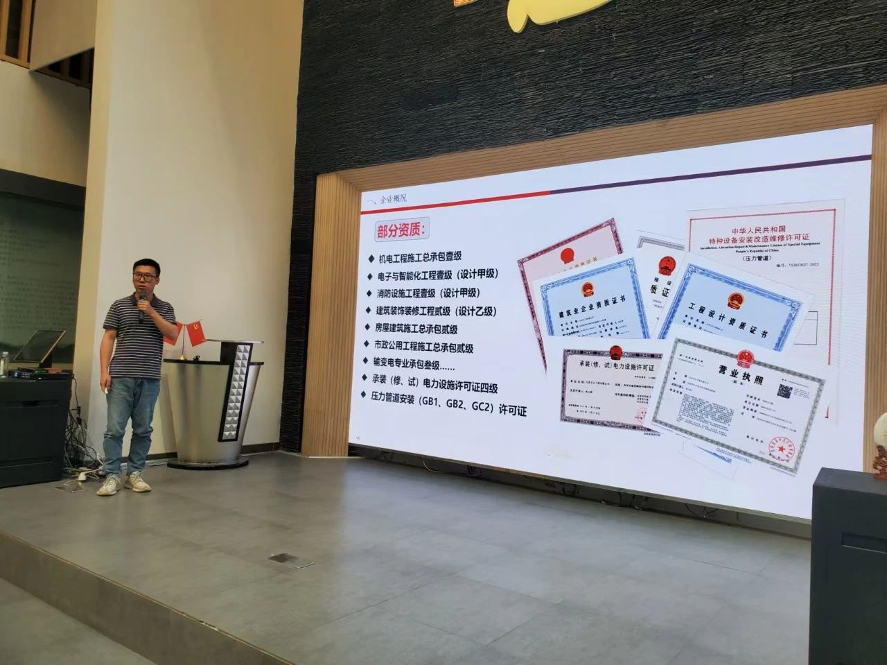 会议伊始,我司总经理助理张嘉炜详细介绍了公司发展历程、业务布局及核心竞争力,重点展示了在机电安装、智慧建造、绿色工程等领域的标杆案例与技术优势。
