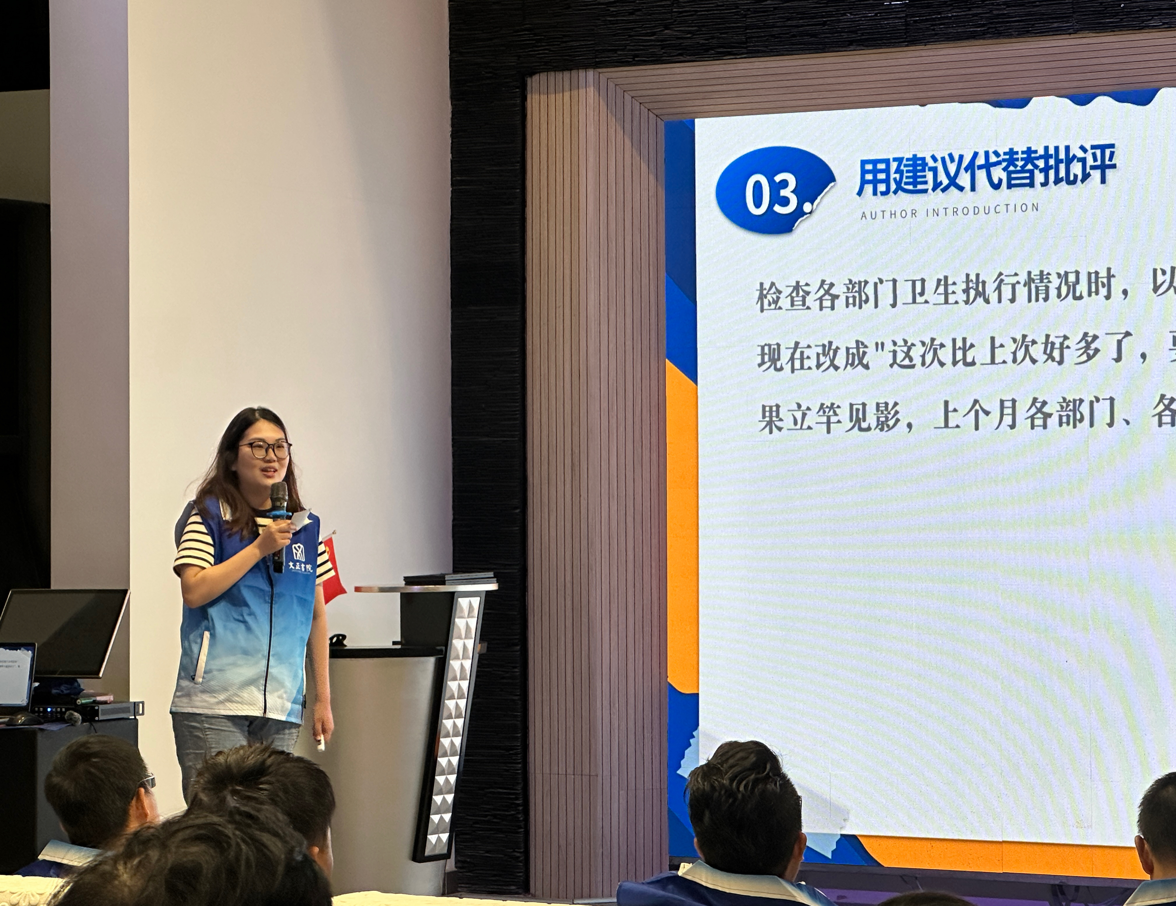 在主题分享环节,公司高管结合自身经验,为员工带来实用职场锦囊。耿总以“内部沟通技巧”为主题,通过真实案例解析职场沟通痛点,并现场教学“三明治沟通法”——以肯定开头、建议居中、鼓励结尾,帮助员工在批评与建议中实现温和高效的表达。